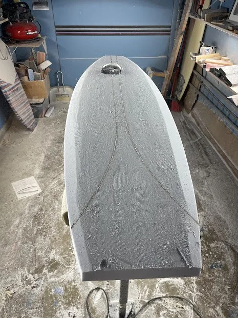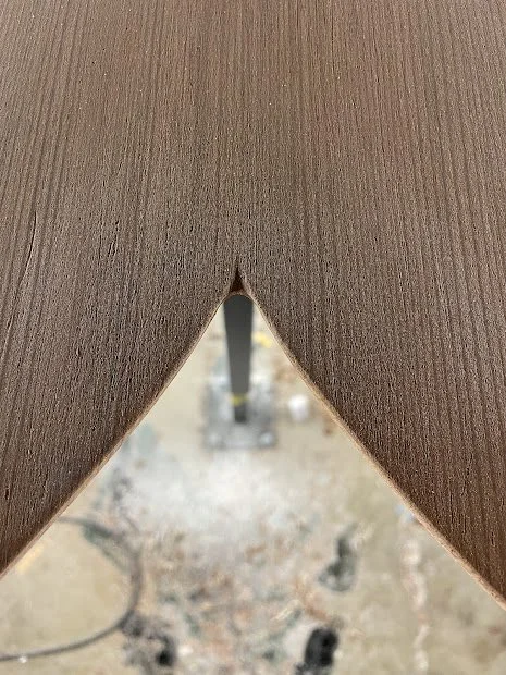 Outward-sweeping redwood and bass wood stringers run from the nose and flare toward the tail, framing the board’s shape and echoing the split of a fish tail, enhancing both strength and visual symmetry. The inlay features reclaimed old growth redwood from Northern California - the same timber used in the earliest California wood surfboards—connecting the board to surfing’s deep roots. Hand-foiled redwood twin fins match the inlay, providing natural flex and drive.