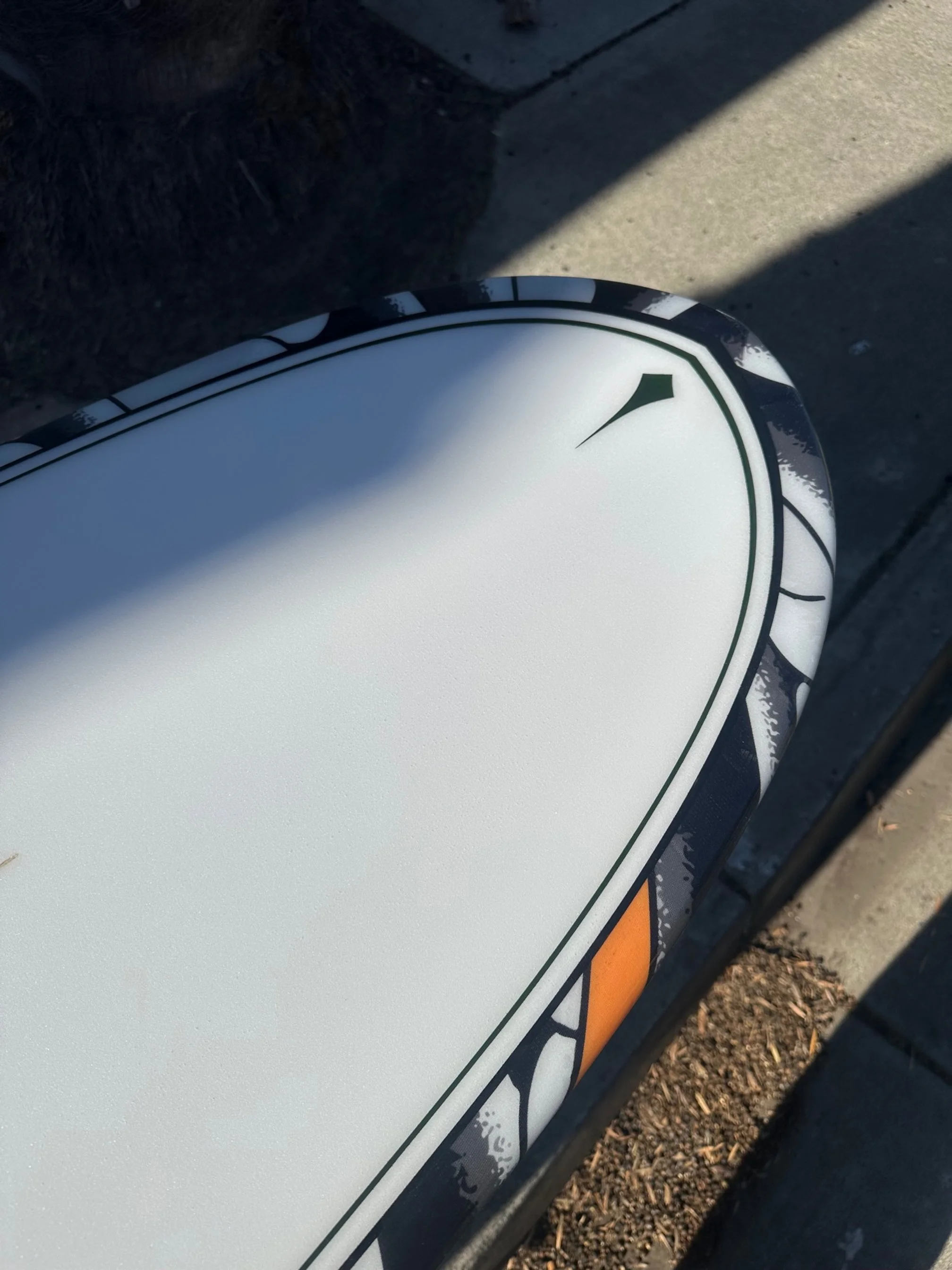 This is a co-lab between me and Stephen Sanchez. The board is a 9’10” flex nose w/wedge Balsa stringer that stops 24” from the nose. Artwork is a traditional Dragon by Stephen Sanchez Printed by Boardlams and glassed at Loner Surf Club